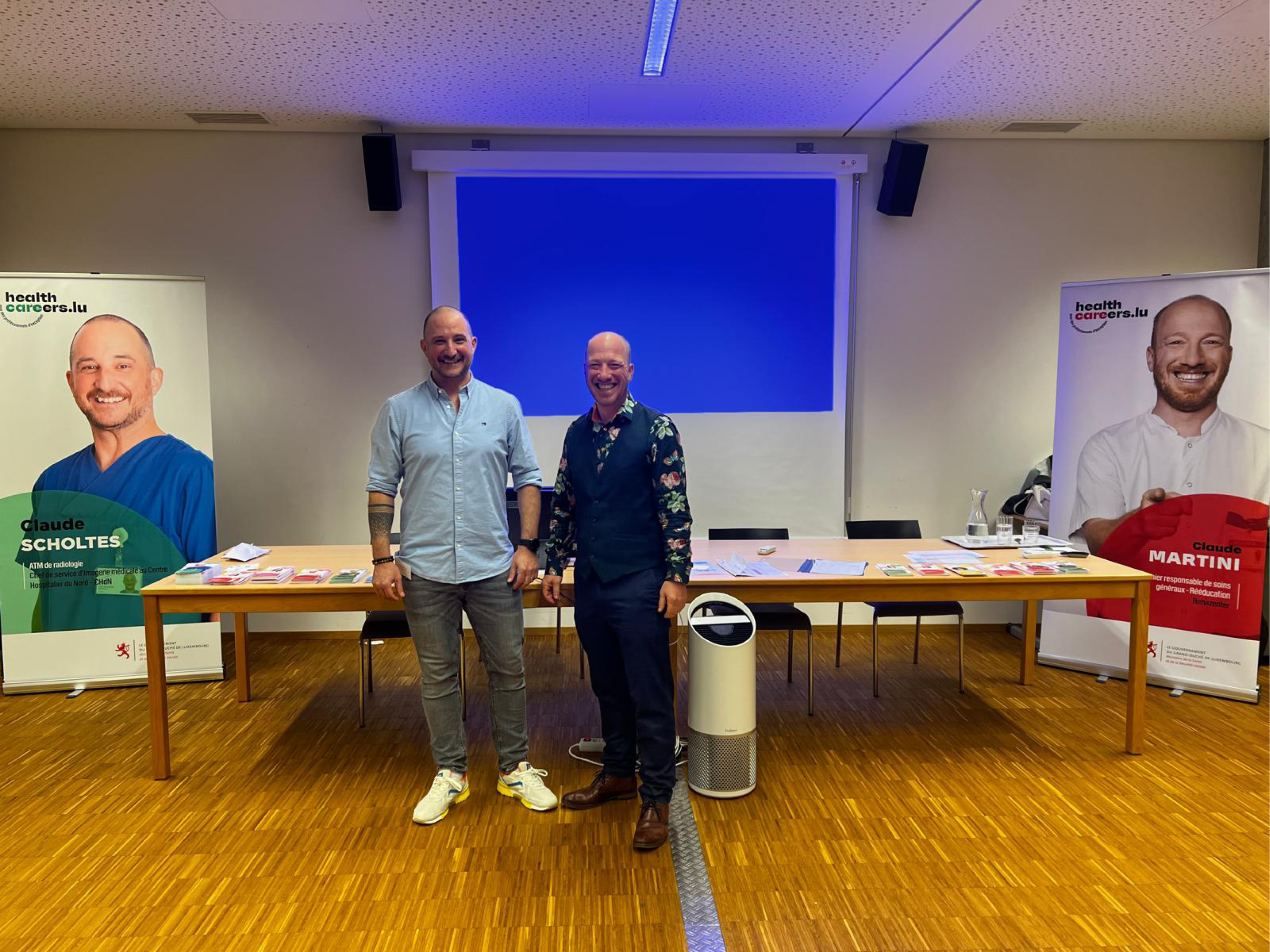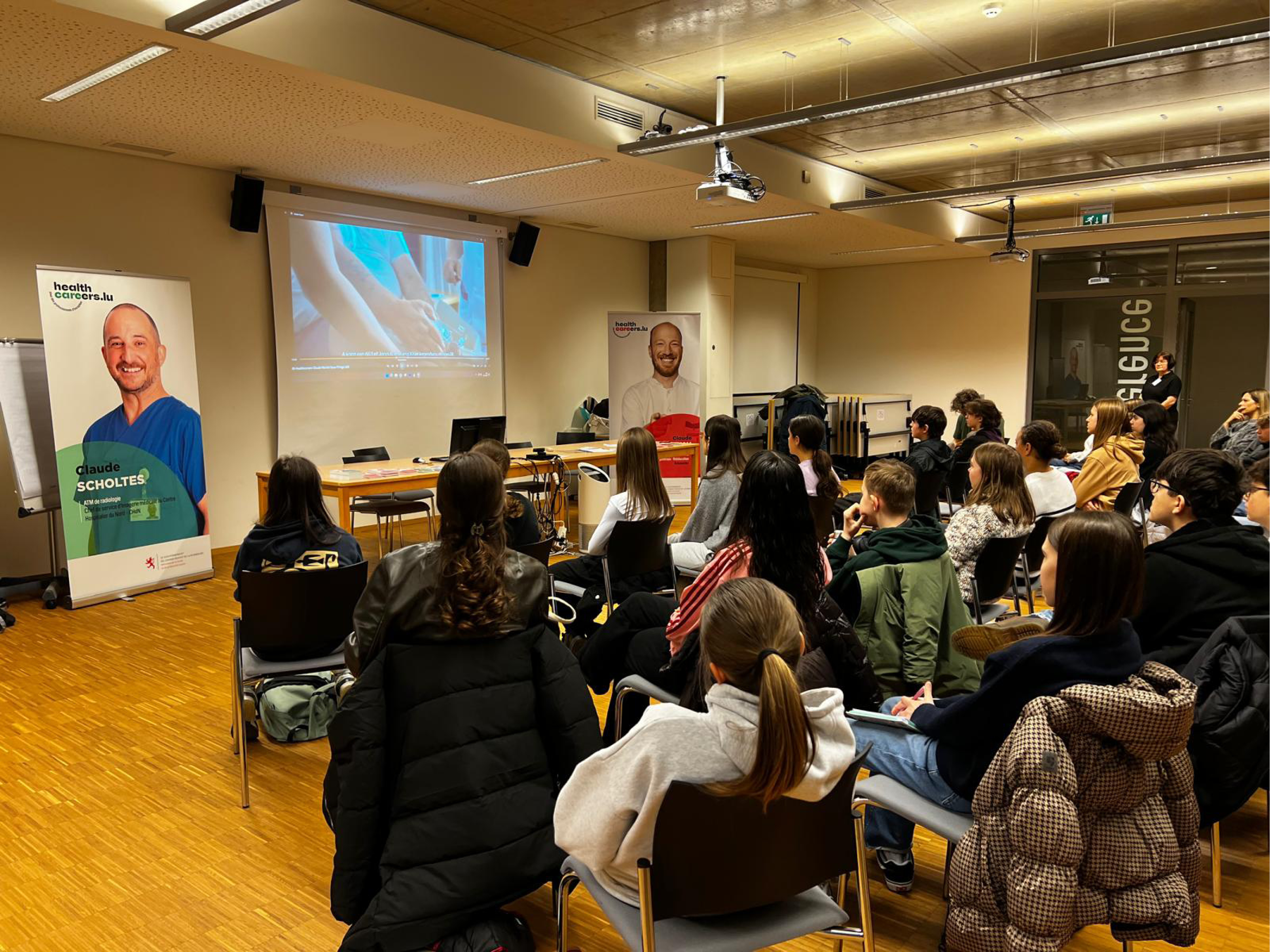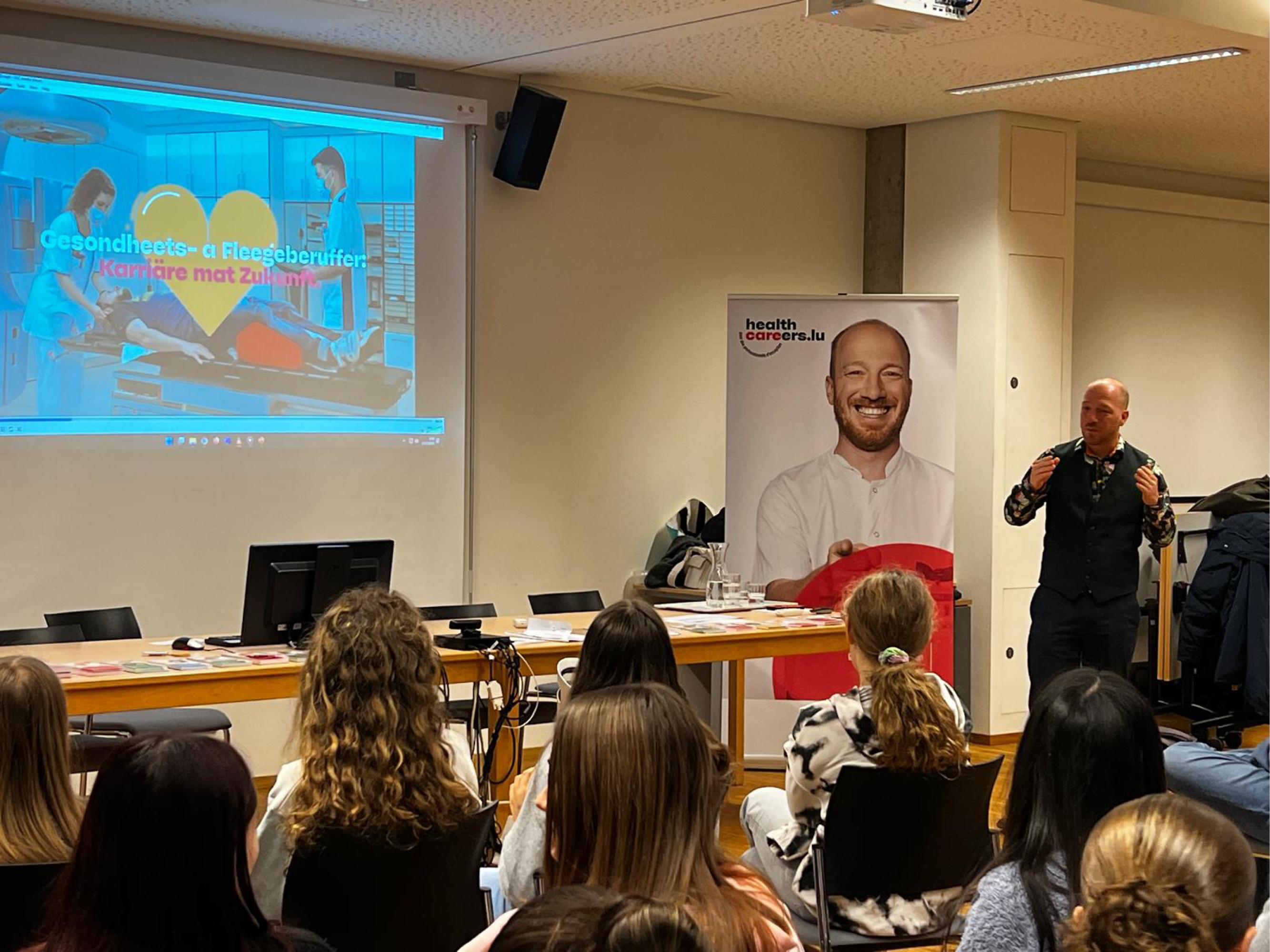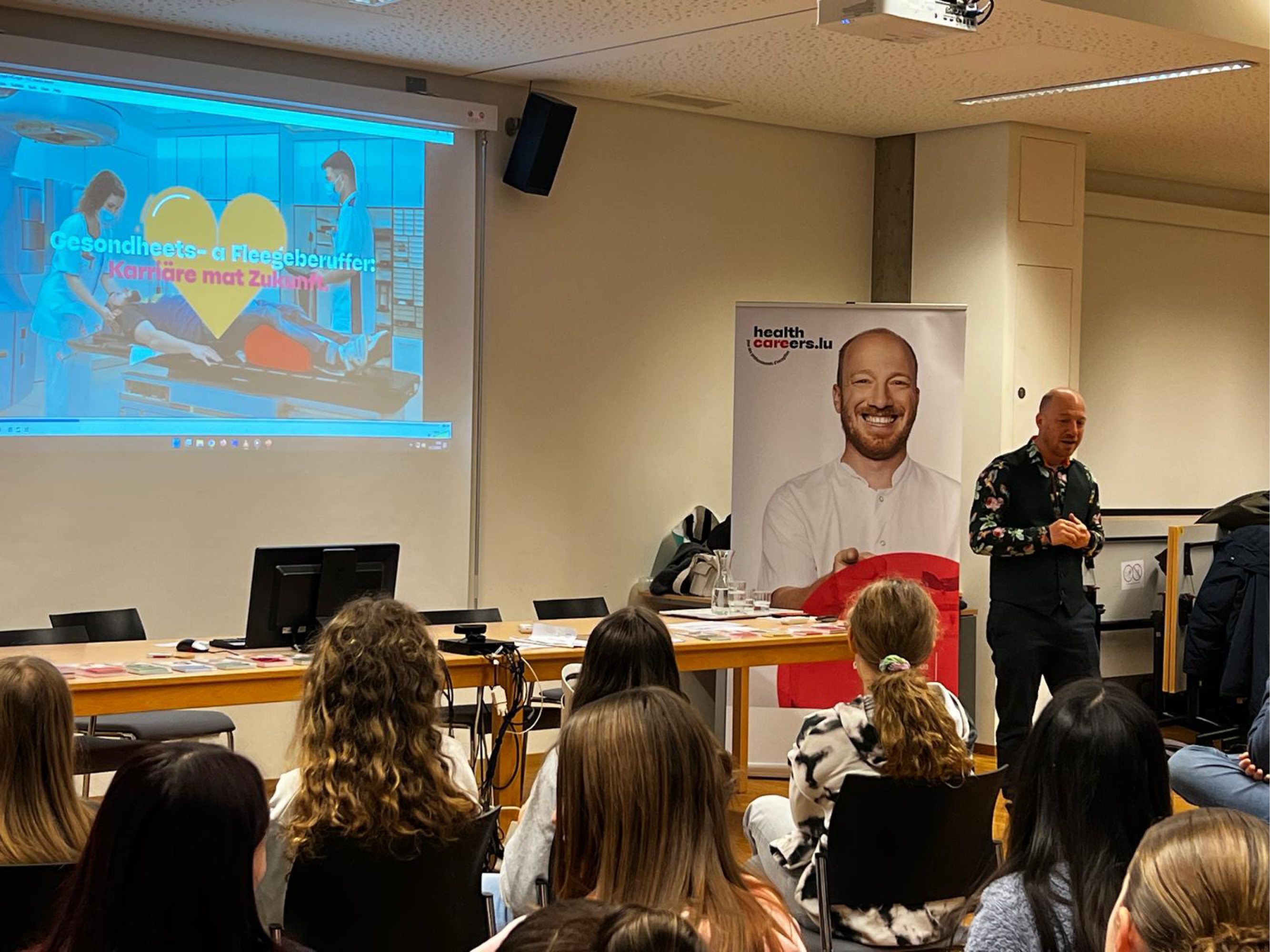 De 17. Januar gouf d'Campagne healthcareers.lu op der « Journée des Patrons » am Lycée Ermesinde virgestallt. Am Kader vun dësem Evenement, goufen d'Beruffer vum Infirmier an dem ATM de Radiologie virun enger Rei Klasse ervirgehuewen. Claude Martini, Infirmier am Rehazenter, a Claude Scholtes, ATM-Radiologie a Chef vum Service d'Imagerie médicale am Centre Hospitalier du Nord (CHdN), hunn d'Sëtzungen animéiert a sinn op d'Froe vun de Schülerinnen a Schüler agaangen. Dëst huet en dynameschen Austausch tëscht de Schüler an de Gesondheetsberuffler erméiglecht.